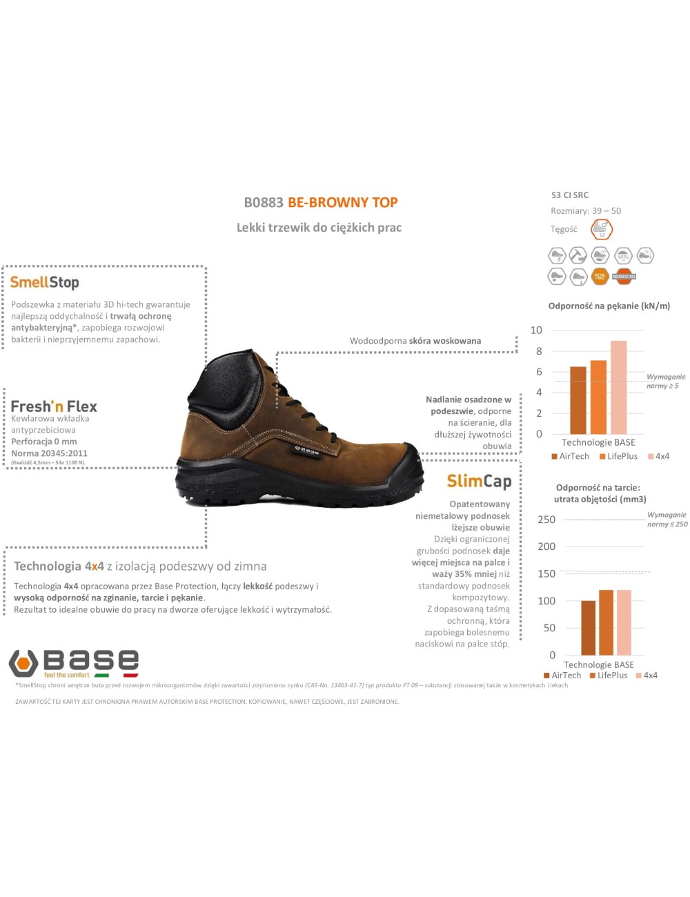 Model Be Browny Top spełnia wymagania normy EN 20345:2011 S3 CI SRC. Zgodnie z wymaganiami klasy ochrony S3 obuwie wyposażono w kevlarową wkładkę antyprzebiciową, a także kompozytowy podnosek SlimCap. Dzięki unikalnej technologii marki Base podnosek ten jest lżejszy od standardowych podnosków kompozytowych, a ponadto ma ograniczoną grubość - niweluje to nacisk na palce i zwiększa wygodę użytkowania. Dodatkowe wzmocnienie w obszarze palców jest odporne na ścieranie, a tym samym przedłuża żywotność obuwia.