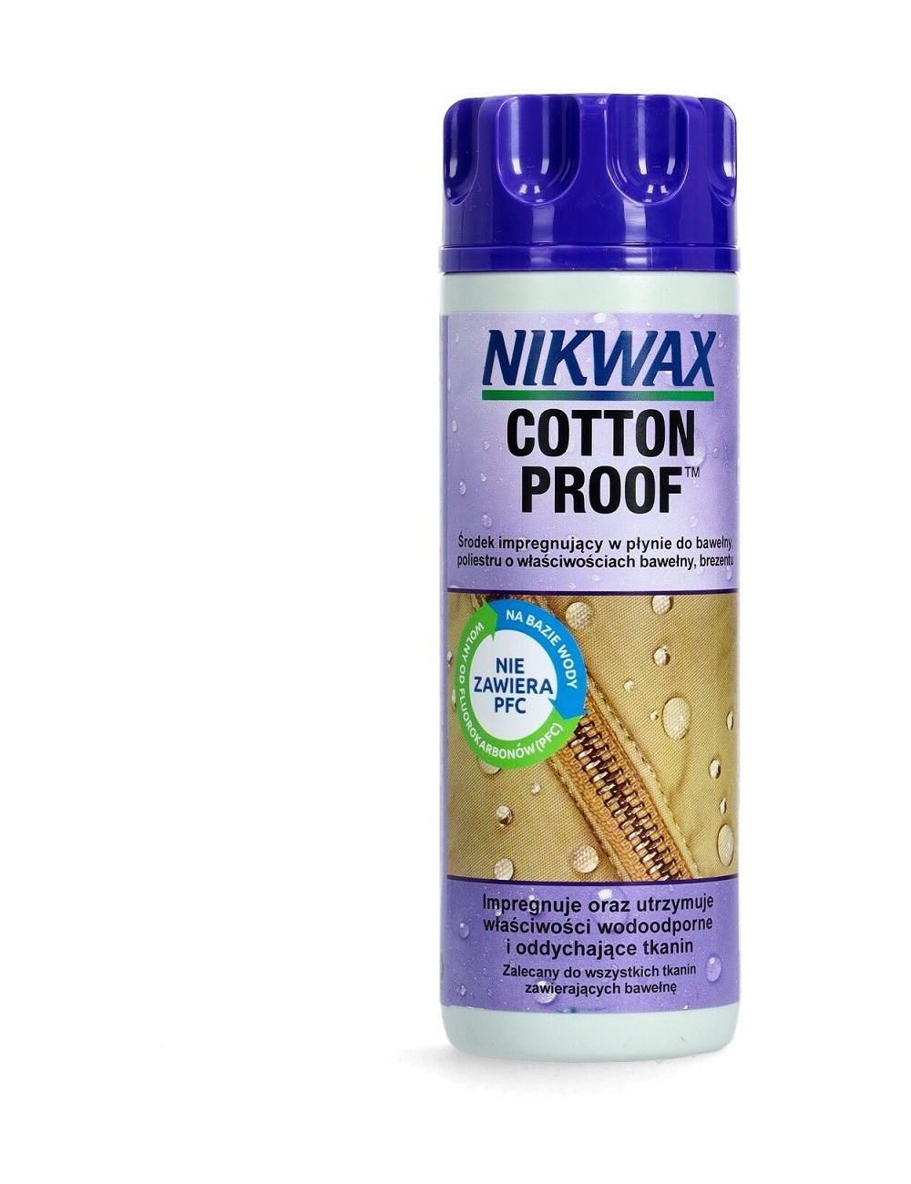 Nikwax Cotton Proof 300ml je snadno použitelný, uživatelsky šetrný a ekologický a vysoce účinný impregnační přípravek na oblečení a outdoorové vybavení. Je určen pro použití na bavlněné, směsové bavlny a polyesteru a plátěné tkaniny. Dodává odolnou vodoodpudivou úpravu bez snížení prodyšnosti nebo zvýšení hmotnosti. Poskytuje vynikající ochranu před vlhkostí. Nevyžaduje sušení v sušičce. Lze jej prát v pračce i ručně. Nikwax Cotton Proof je také zcela bezpečný. Je na vodní bázi, nehořlavý a neobsahuje škodlivé těkavé organické sloučeniny (VOC) a fluorované uhlovodíky. Je určen pro použití na vyčištěné oblečení a plátěné vybavení, jako jsou stany a batohy.