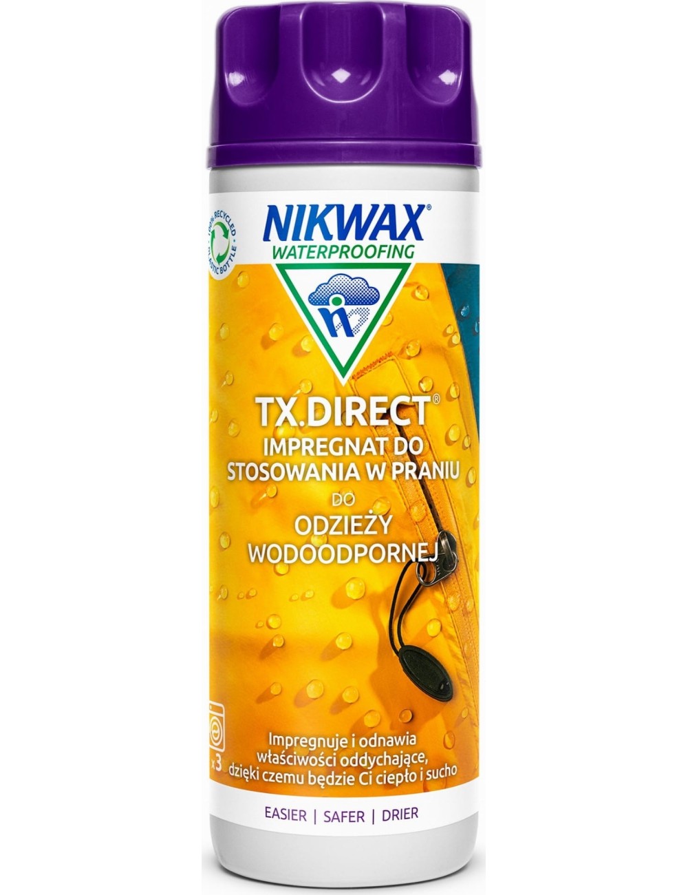Nikwax TX. Direct Wash -In Waterproofing je určen pro nepromokavé oblečení s membránou, včetně Gore-Tex® a eVent®. Je bezpečný pro membrány – neucpává je a umožňuje volný únik vlhkosti. Prodlužuje životnost oblečení a obnovuje nepromokavé a prodyšné vlastnosti. Je rychlý a snadný na použití a lze jej prát v pračce i ručně. Nikwax TX. Direct Wash -In Waterproofing neobsahuje fluorouhlík. Je na vodní bázi. Je zcela šetrný k životnímu prostředí, bezpečný pro použití, biologicky odbouratelný a nehořlavý.
