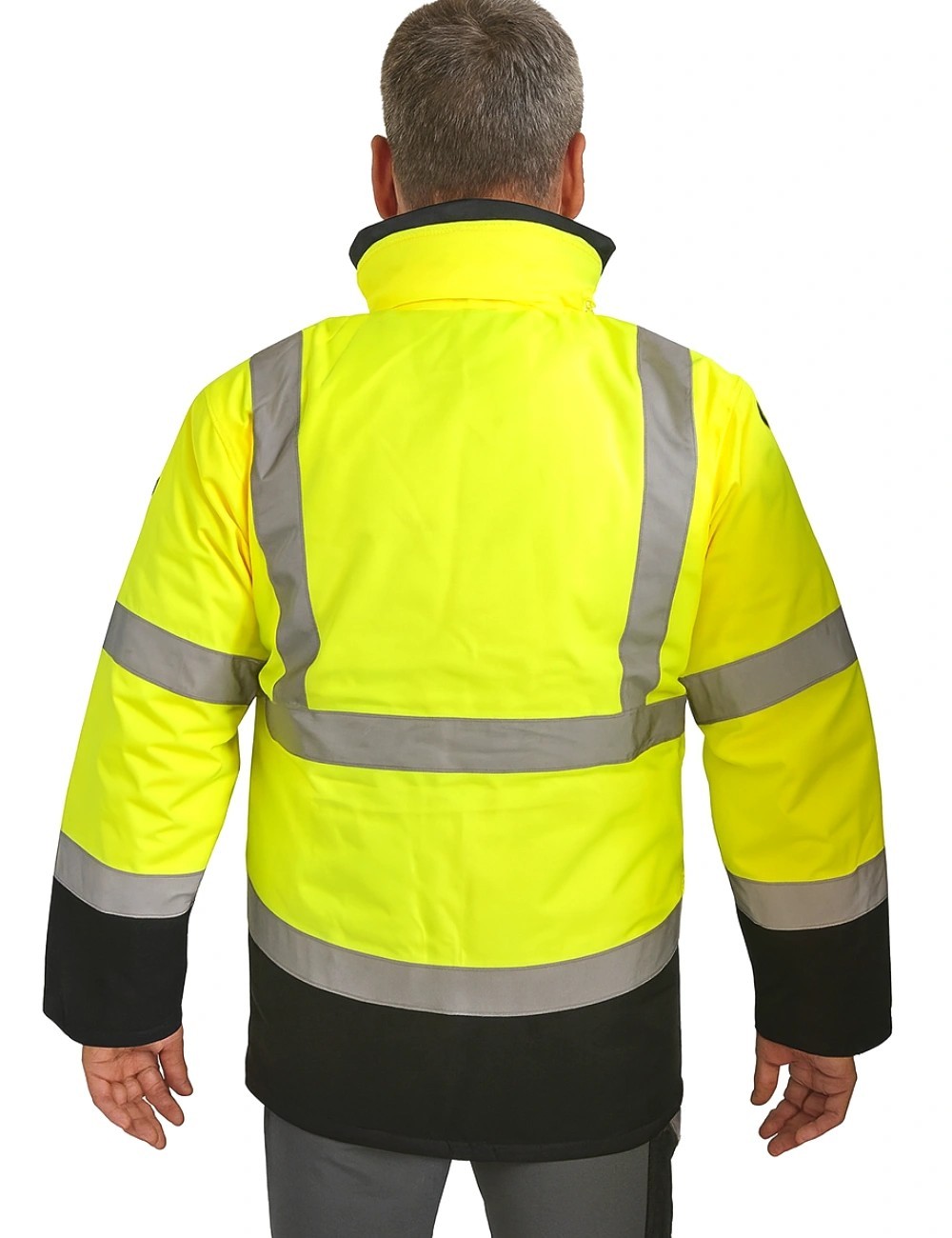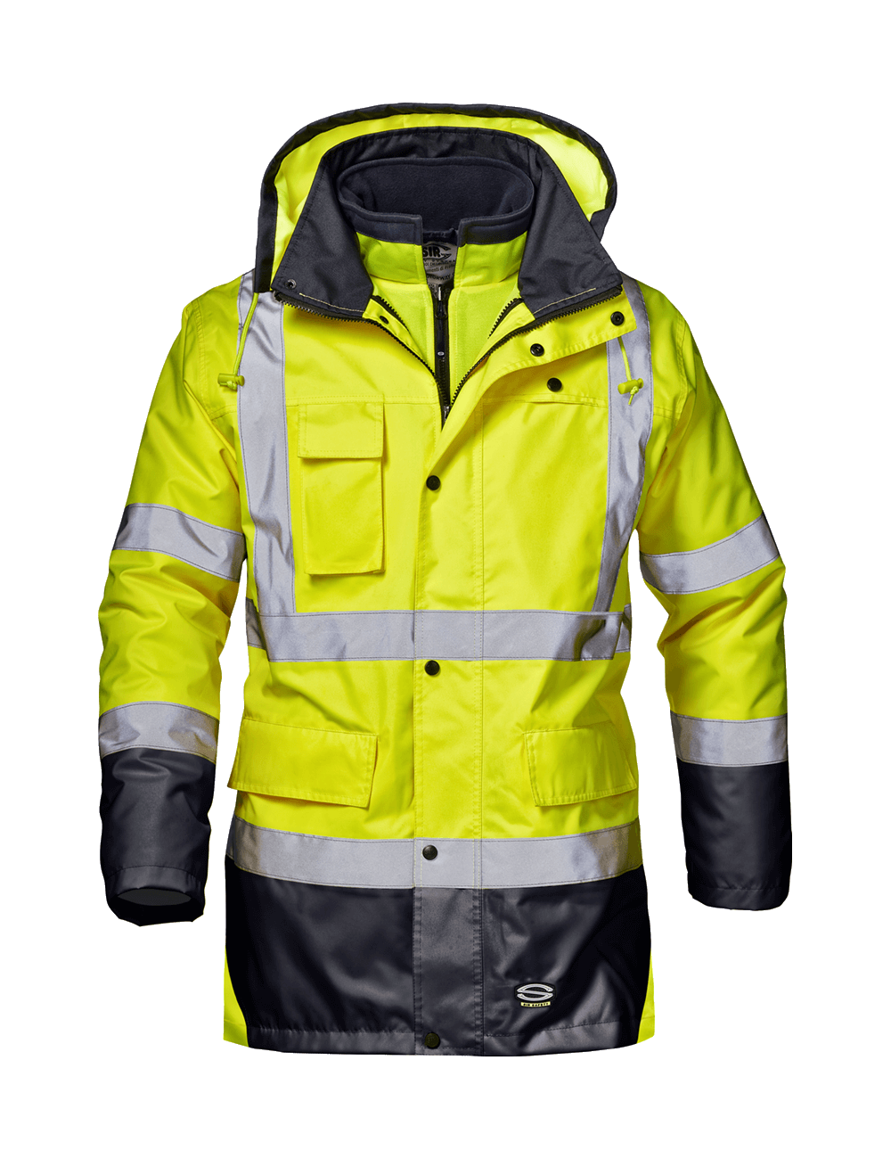 Pracovní bunda Sir Safety Motorway 4 v 1 s reflexní izolací je bunda ve stylu parky vyrobená z nepromokavého materiálu s další vrstvou nepromokavého polyuretanu. Bunda je dlouhá a sahá až pod boky. Vnější, nepromokavou vrstvu lze oddělit od izolační vrstvy, která má také odepínací rukávy a lze ji použít jako reflexní vestu.